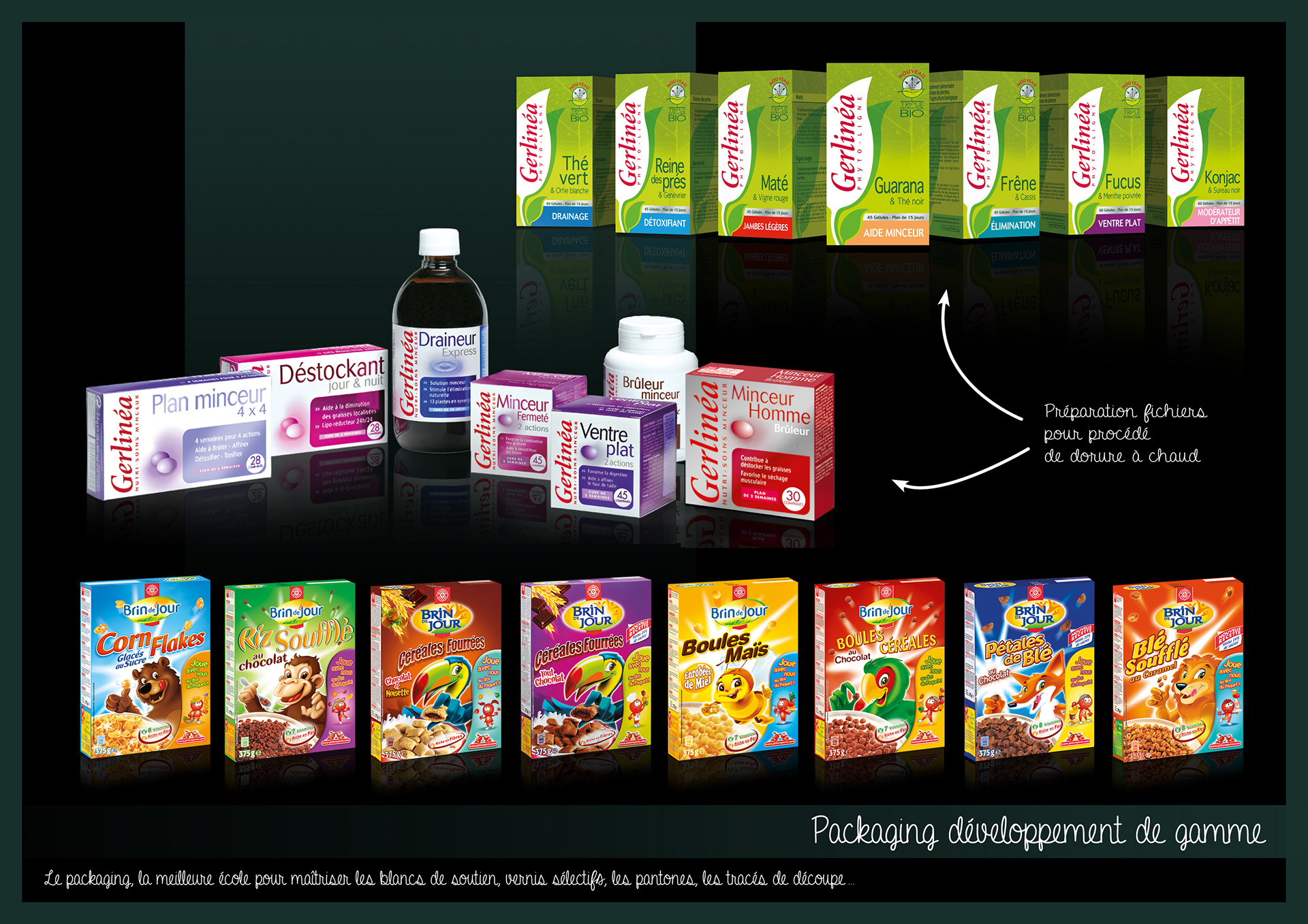 Dorure à chaud, blanc de soutien, imposition, Pantones, vernis sélectifs, traits de coupes, débords...